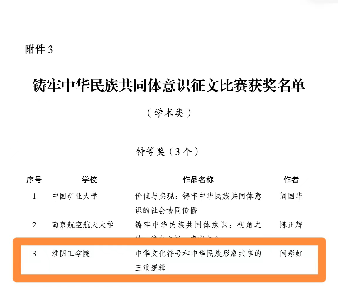 近日,由江苏省民族宗教事务委员会、中共江苏省委宣传部、中共江苏省委统一战线工作部和江苏省教育厅共同主办的江苏省第一届“铸牢中华民族共同体意识·高校在行动”系列活动评选结果公布,我院教师闫彩虹的论文《中华文化符号和中华民族形象共享的三重逻辑》获学术类征文比赛特等奖。此次活动全省有160多所高校、共计40余万人次参加。同时,我校还荣获了优秀组织奖,离退休党工委选送的作品也获得普通类征文比赛特等奖,建工学院、人文学院党委等选送的作品在演讲比赛中也取得优异成绩。